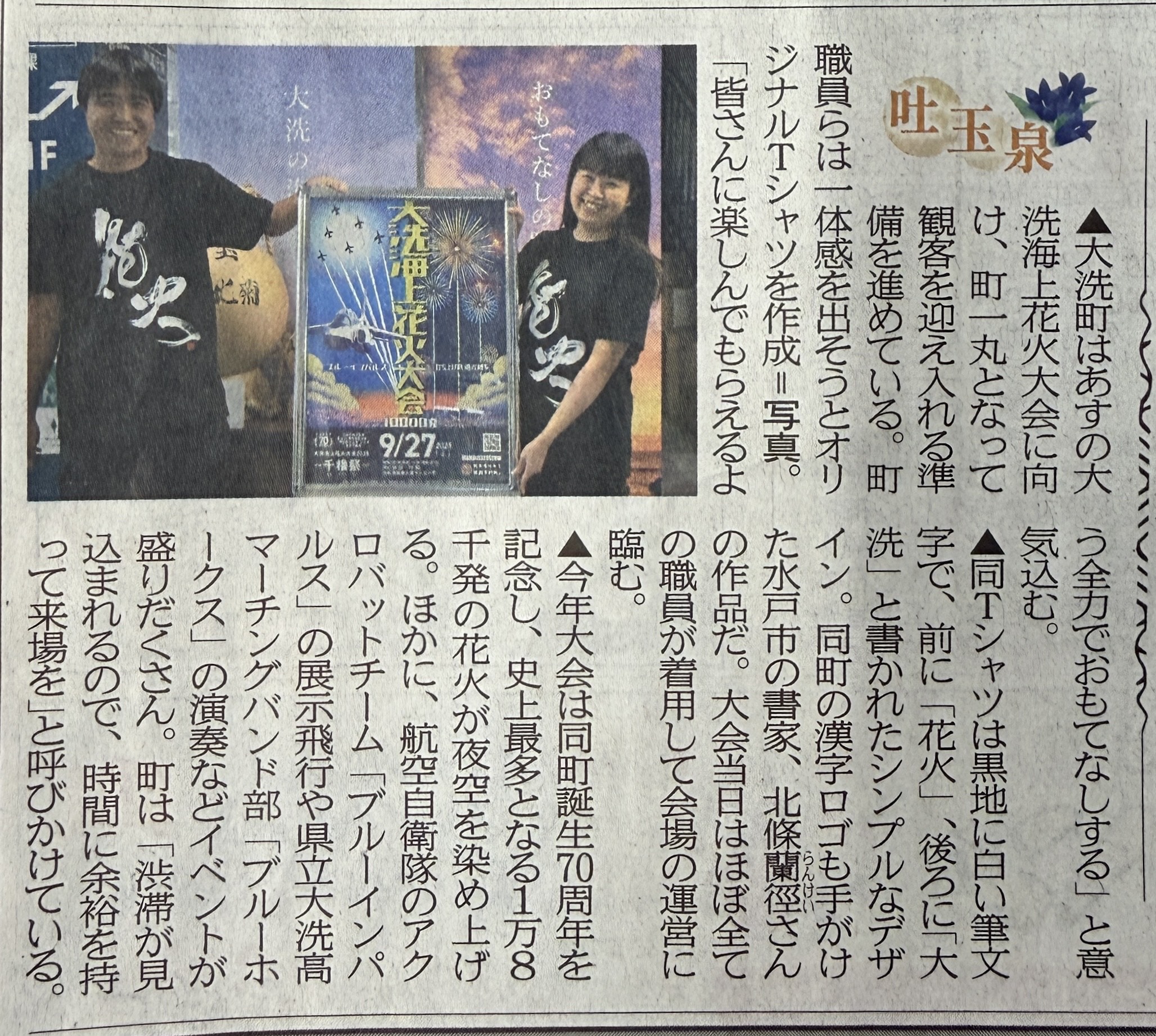 2025.09.26 花火大会オリジナルTシャツ完成! 令和7年9月26日(金)茨城新聞 いよいよ明日は「大洗海上花火大会2025~千櫓祭~」です! 町一丸となって多くのお客さまをお迎えするために、花火大会オリジナルTシャツを作成いたしました。 前面に「花火」、裏面に「大洗」の筆文字がプリントされており、文字は書家北条蘭徑先生に書いていただきました。 このTシャツを職員が着て、皆さまをお迎えいたします。 会場周辺の道路は混雑しますのでお早目のご来場を、また、夕方は肌寒くなりますので念のため上着をお持ちください。 大洗海上花火大会、大いにご期待ください!! Tweet Share RSS